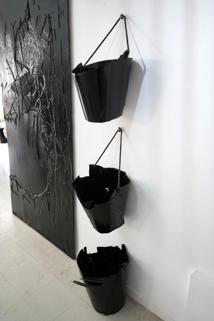 {...}"Τα εύθραυστα οστέινα αντικείμενα του Νίκου ανταποκρίνονται στη συνέχεια το ένα στο άλλο, απλώνονται στον εκθεσιακό χώρο σαν ένα στρατόπεδο το οποίο στήνεται και διαλύεται για να εισβάλει σε έναν συγκεκριμένο τόπο. Υπάρχει μια αυτοσχέδια σχεδία και ένα μπουκάλι στη θάλασσα. Αυτή η τεράστια αλλά εύθραυστη στολή κατάδυσης μας προειδοποιεί ότι αυτό το ταξίδι δεν είναι χωρίς δυσκολίες- μας στοιχειώνει και μας συναρπάζει ταυτόχρονα. Στον τοίχο κρέμονται ξεκοιλιασμένοι κουβάδες έντονης μαυρίλας. Περιέχουν το κενό και το όλον που προσφέρει αυτή η κατάδυση. Μια συσσώρευση στρωμάτων και υποτιθέμενων εμποδίων, τα έργα παράγουν χώρους όπου κυκλοφορούν μαζί η μηχανική σκέψη και η ομορφιά του ημιτελούς." {...} Sophie Fardella